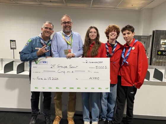 Lors de la Foire du VR neuf et d’occasion d’automne 2025, l’ACVRQ a eu l’honneur de remettre un don de 5 000$ au 129e groupe Scouts de Québec, afin de soutenir leurs activités. Sur cette photo, nous retrouvons Steve Lapierre, directeur général de l’ACVRQ, en compagnie des scouts, un moment empreint de fierté et de solidarité.